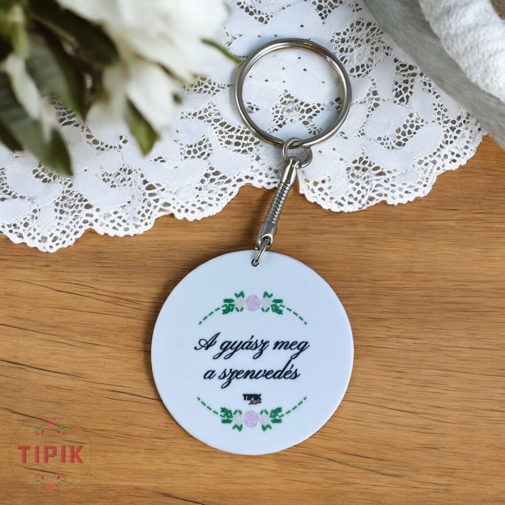A kulcstartó mérete 4,5 cm, anyaga fehér műanyag, ami 5 mm vastag, így nagyon teherbíró. Ha rajta ugrálsz, akkor már lehet eltörik. A minta levakarhatatlan, víz és időjárás álló, nem fog lejönni!