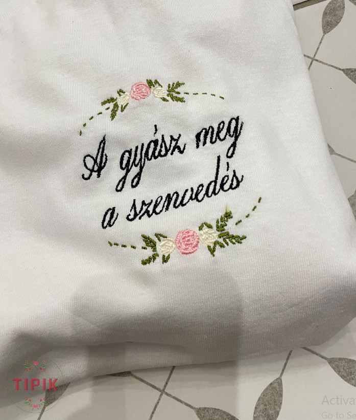 A vicces feliratos póló mintája gépi hímzéssel készült, szürke, fekete és fehér pólóra kérhető, férfi-női szabással.