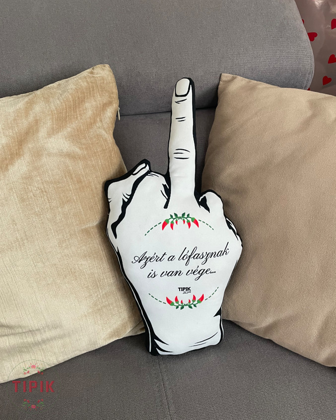 A fuck off párna egyedileg készül egy manufaktúrában, direkt a kéz alakjába varrott és töltött formapárna, nem csak egy huzat.