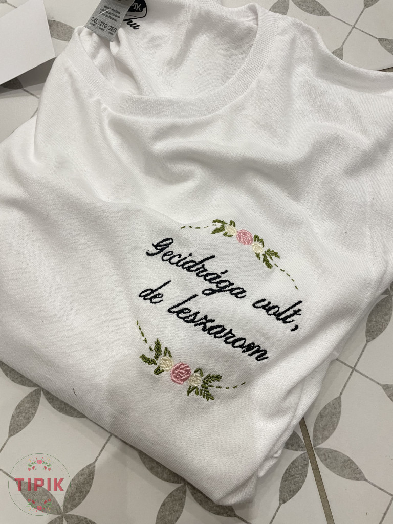 A minta gépi hímzéssel készült, szürke, fekete és fehér pólóra kérhető, férfi-női szabással.