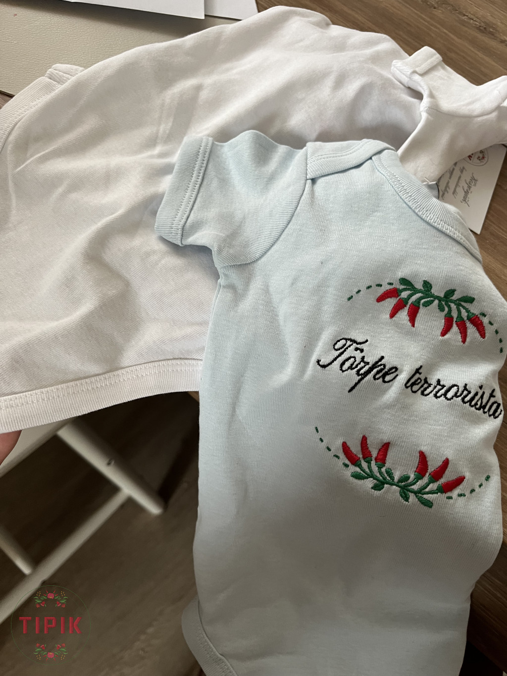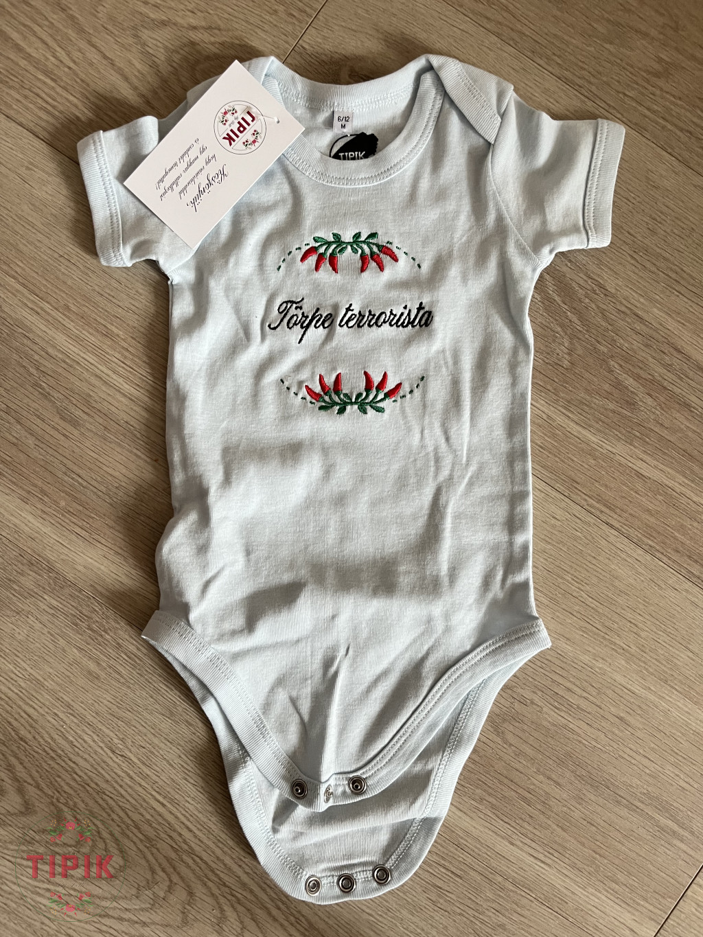 Törpe terrorista - hímzett baba body - világoskék, paprikás, 6-12 hónaposnak - csalóka a kép, tényleg világoskék, a képek között látod fehér body mellett:)
