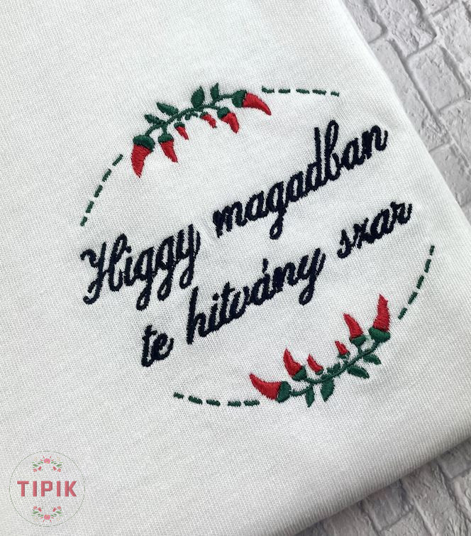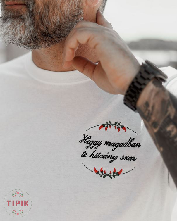 A vicces feliratos póló mintája gépi hímzéssel készült, szürke, fekete és fehér pólóra kérhető, férfi-női szabással.